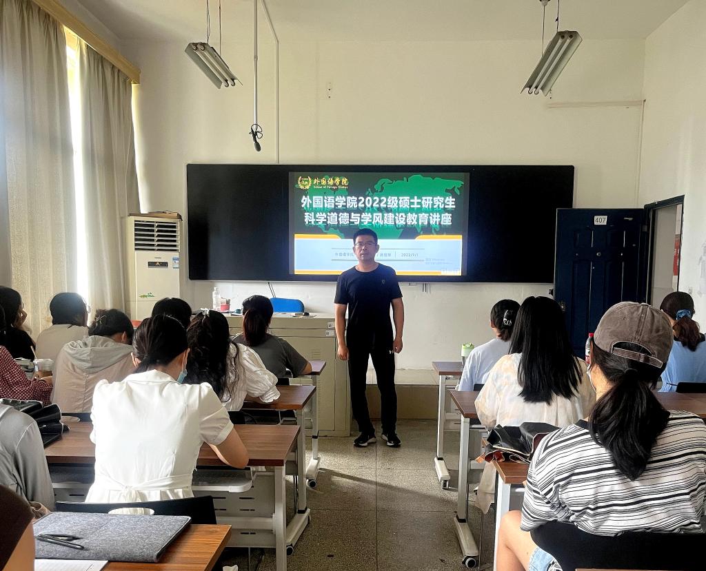 为使2022级硕士研究生新生尽快适应研究生生活,熟悉个人培养方案制定等方面事务,外国语学院于9月1日下午开展2022级硕士研究生学业规划与职业发展教育、科学道德与学风建设教育等系列讲座。讲座由副院长武俊辉主讲。系列讲座内容如下: