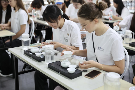 午餐时,茶香排骨、茶叶蛋等特色茶餐,让大家从味蕾上进一步感受茶与生活的融合。午后的茶叶审评课上,营员们学习“看闻品”审评法,通过观汤色、闻香气、品茶味,解锁茶叶品鉴的奥秘。茶艺师的盖碗冲泡演示后,大家亲手实操,在注水、出汤间感受茶艺的优雅。创意茶包工坊里,干茶与茉莉、陈皮等食材碰撞,营员们调配个性茶包、设计标签,将茶香与巧思封装成独特纪念。