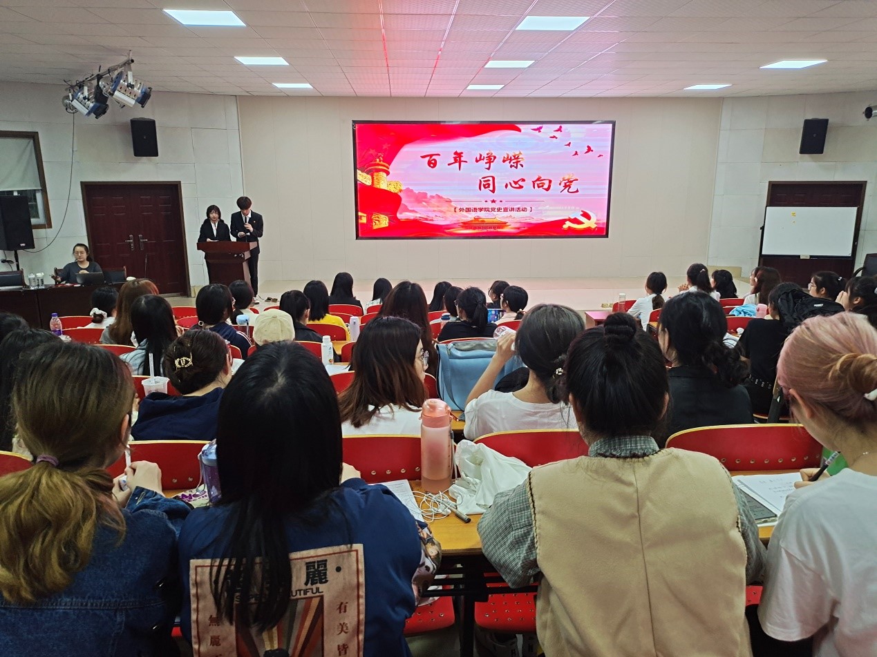 为深入推进党史学习教育,用党的奋斗历程和伟大成就鼓舞斗志,坚定信念,砥砺品格,2021年5月25日晚,外国语学院本科生党支部在文科楼A100开展“百年峥嵘,同心向党”党史宣讲活动。本科生党支部书记禹敏,学生党建辅导员袁媛,本科生党支部组织委员徐敏,宣传委员仝苏军出席此次活动。