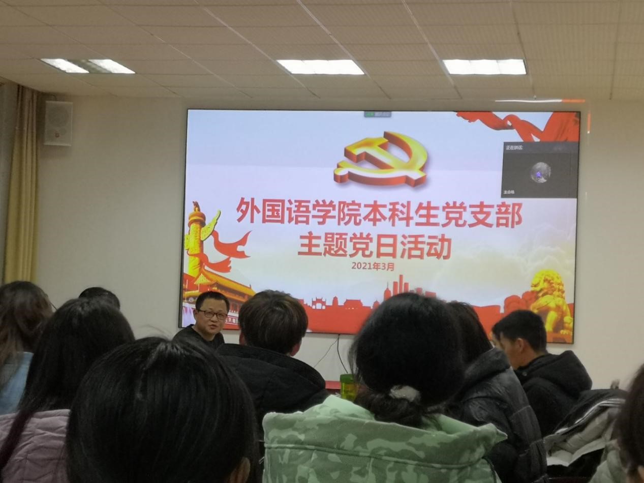 2021年3月8日晚七点半,外国语学院本科生党支部在文科楼A603开展主题党日活动,专职组织员汪功伟出席会议,外国语学院本科生党支部全体成员和部分优秀积极分子参加。