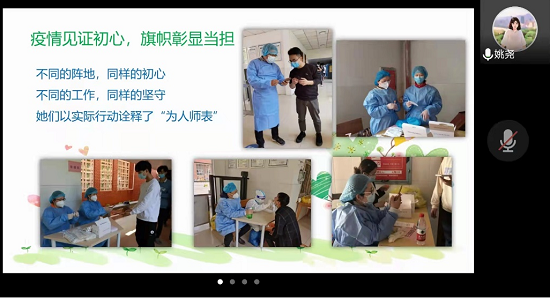 各支部书记总结支部和教研室在前期学院抗疫先锋队所做的工作,表扬了支部党员和教研室(科室)非党员老师第一时间积极响应院党委招募志愿者的号召,加入抗疫先锋队,冲在疫情防控最前线,发挥了模范先锋作用,以实际行动践行了一个共产党员的初心和使命。从“疫情见证初心 旗帜彰显当担”和“心聚力 齐战疫”两个方面总结支部在战疫中涌现的感人故事和先进事迹,激发、教育全体教师,尤其是党员教师冲锋在前,勇于当担。一张张感人的照片、一幕幕志愿者忙碌的身影,都彰显学院教师在不同的阵地,坚守同样的初心,他们以实际行动诠释了“为人师表”。