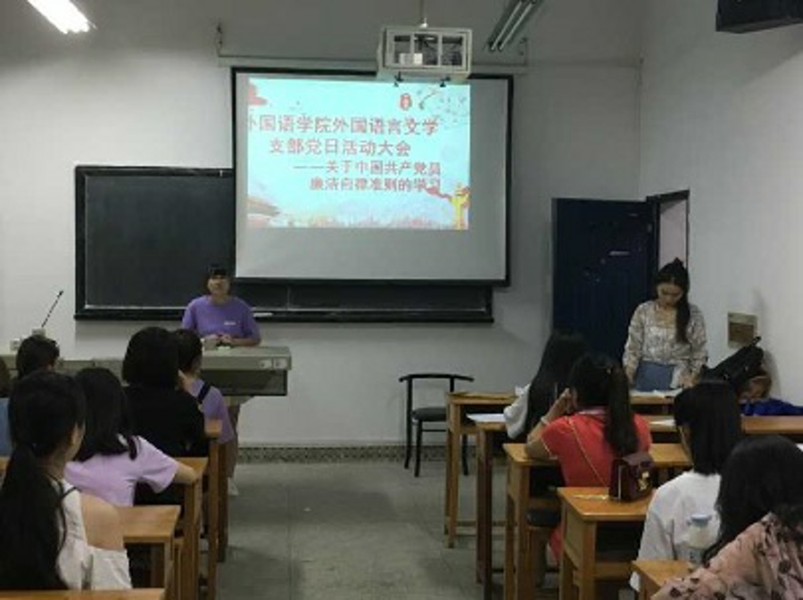 2018年6月10日晚上7点,外国语学院外国语言文学党支部在九教407教室开展了《中国共产党党员廉洁自律准则》主题学习。参加此次学习是外国语言文学党支部党员。