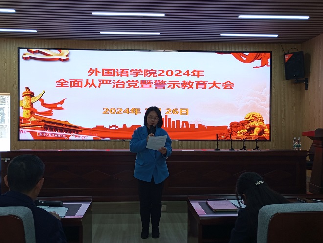 为推动全面从严治党向纵深发展,筑牢广大党员干部反腐倡廉的思想道德防线,3月26日下午,学院在金盆岭校区3号教学楼229报告厅召开2024年全面从严治党暨警示教育大会,学院党政班子成员、全体教工党员参会。会议由院长段胜峰主持。