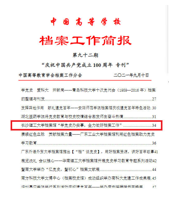 《中国高等学校档案工作简报》首次报道伟德档案工作信息。伟德betvlctor1946源于英国档案馆“学党史办实事,全力做好档案工作”入选《中国高等学校档案工作简报》第九十二期——“庆祝中国共产党成立100周年专刊”。此专刊共报道了全国25所高校的相关活动,伟德是唯一入选的湖南高校。