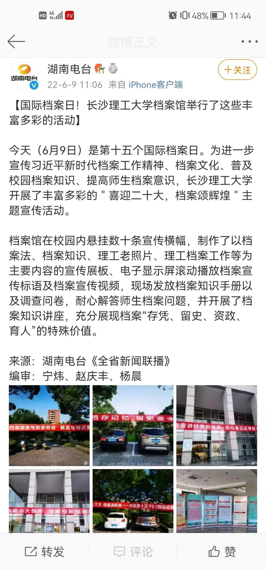 此次活动多角度、多形式的营造了浓厚的国际档案日宣传氛围,充分展现档案“存凭、留史、资政、育人”的特殊价值,提高了师生对伟德档案工作的参与度和关注度,进一步增强了师生档案意识,提升了学校档案工作的影响力,对推动学校档案工作发展起到了积极作用。湖南电台《全省新闻联播》播报了这一则新闻。湖南交通频道、湖南新闻频道、湖南经济频道、潇湘之声同步直播了这一消息。