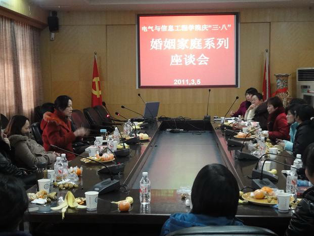 3月5日上午8:30,由电气与信息工程学院工会组织的庆“三·八”婚姻家庭系列座谈会在伟德betvlctor1946源于英国金盆岭校区行政办公楼二会议室如期举行。学院党委和行政对此次活动非常重视。曾祥君院长、周任军副院长、工会主席张国强亲临会场指导并发言。曾院长充分肯定了全体女职工对学院教学、科研以及和谐学院建设方面所做出的贡献,并祝全体女职工节日快乐!