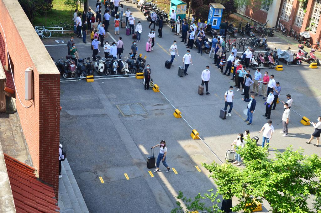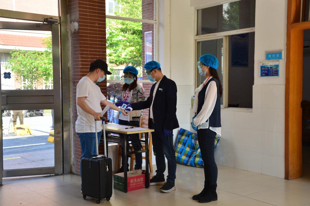 演练以现场情景模拟的方式进行,对学生返校、日常进出宿舍楼、公共区域消毒、发热处置、应急预案启动等环节进行了现场模拟,并针对可能出现的异常情况进行实战演练。演练开始,返校学生在公寓入口正确佩戴口罩,间隔1米排队刷卡进入公寓,由宿管员测量体温正常后依次通过,不在大厅逗留,直接返回宿舍,开窗通风。工作人员发现一名返校学生体温异常,立即进行登记,引导学生至“观测等候区”,同时拨打校医院值班电话,并通知校区负责人和辅导员老师。宿舍区进行消毒通风。整场演练在学校疫情防控领导小组的指挥下,严格按照方案规定流程进行,分工明确、反应迅速、协调有序,提高了公寓相关工作人员应对疫情的防控意识和应急水平,进一步优化了校园应急事件的报告和处置流程。