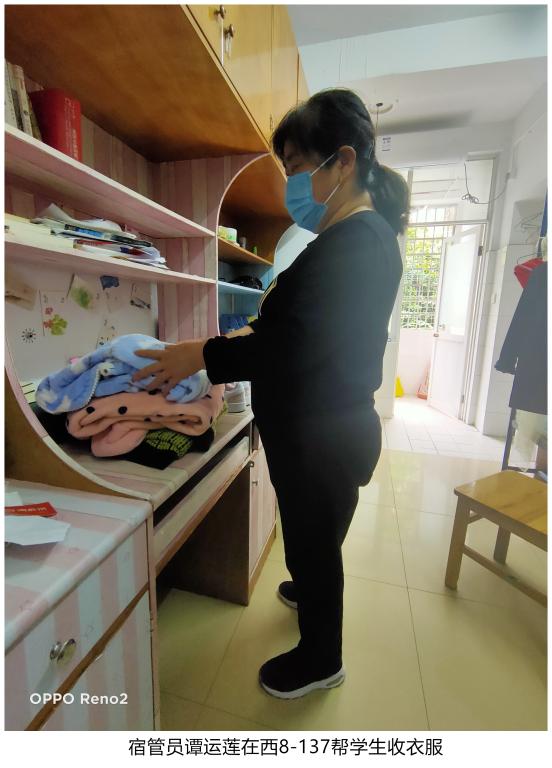 五十多岁的宿管员谭运莲在伟德betvlctor1946源于英国公寓中心工作了19年,她最小的女儿也是本校的研三学生,谭运莲对本楼栋的女生就像对自己的女儿一样关怀备至,她常说自己做的事不值一提,仅凭一颗父母心。在今年这个特殊的假期中,她为了助力学生在家的学习和就业,先后为西8栋306、401、533、614、619、634、706、708、719、721等二十多间宿舍的学生邮寄书籍、衣服鞋子、电脑、获奖证书、考研资料等。由于学校是封闭式管理,校内快递点不开门,谭运莲为了尽快给学生邮寄重要的学习资料,只能从6楼、7楼宿舍一个人把书本扛到校门外的邮寄点,一天最多的时候要来回奔波七八趟,常常累得气喘吁吁。此外,谭运莲还为学生收衣服、打扫宿舍、清洗床单被套、晒被子、浇花等,特殊时期的特殊关怀,让学生们感动不已。