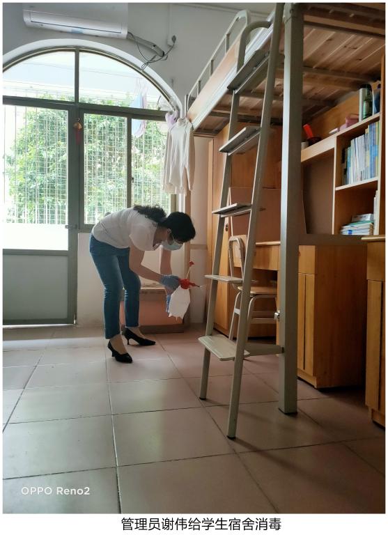 为做好开学前的准备工作,宿管员除每日完成楼栋巡查和宿舍公共区消毒外,还对全体学生宿舍进行消毒、通风,对公寓水、电、消防器材进行全面检查,对洗衣房、饮水机、空调等进行消毒督查等。此外,在公寓中心的安排下,宿管员还参加了新冠肺炎防控知识、应急预案的学习和开学演练等,通过学习和演练,大大提高了管理员应对疫情的能力,为复学后公寓工作的开展做好了充足准备。