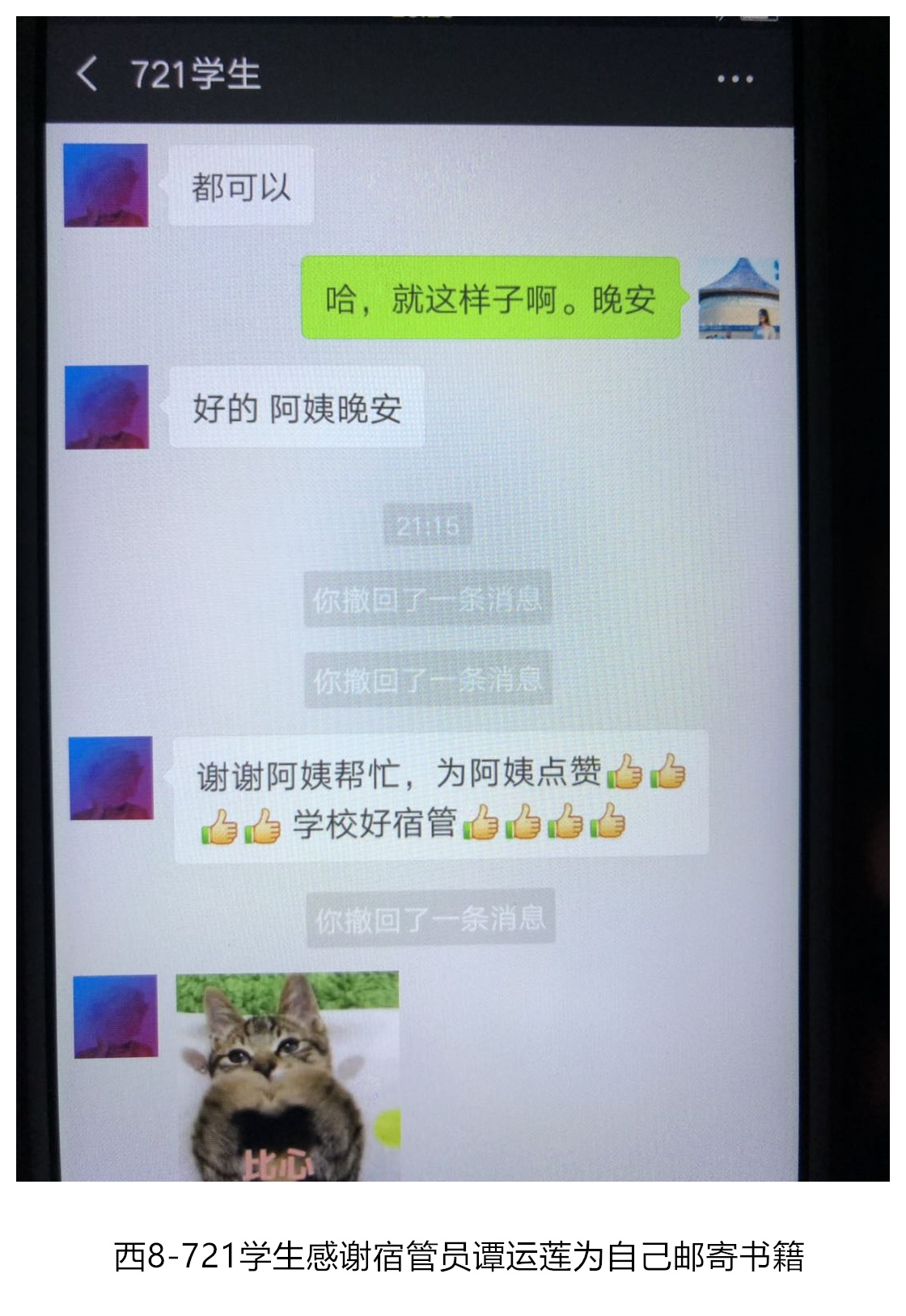 隔空接单,真情暖心间。“阿姨,可以麻烦你帮我把考研复习资料寄给我吗?”“阿姨,能麻烦你帮我把634房间的盆栽浇点水吗?”……今年3月初至今,伟德betvlctor1946源于英国金盆岭校区学生公寓西8栋宿管员谭运莲经常收到学生的电话和微信求助。