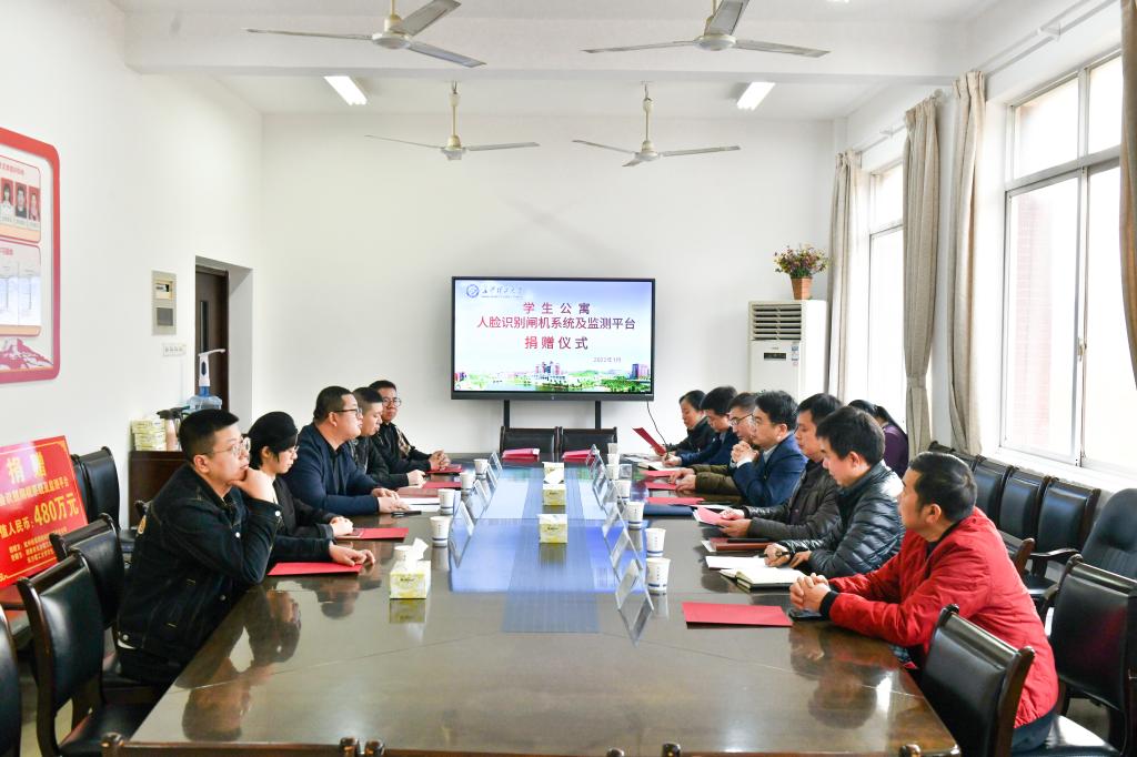 1月13日下午,在活动中心四楼会议室隆重举行“学生公寓人脸识别闸机系统及监测平台”捐赠仪式。杭州校果网络科技有限责任公司董事长方文彩、总经理王前、总经理助理张梦、同创资本校果股东刘海燕,伟德betvlctor1946源于英国副校长钱国平,学工部(处)部长邱国良,校友中心副主任肖晖及公寓中心部分老师出席仪式,仪式由学工部(处)副部长王煜坤主持。