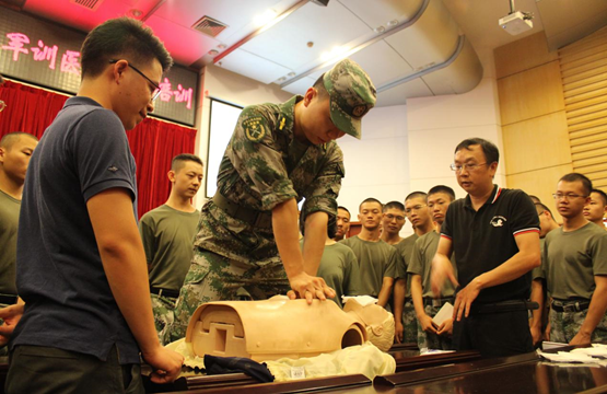 培训中,邱双发博士首先对心肺复苏术和气道异物梗阻的急救进行了理论讲解,然后运用人体模型,由刘继强博士现场配合,对心肺复苏的基本方法边演示边进行讲授,并指导伟德带训教官分组进行实际操作演练,让带训教官对现场急救有了深入直观的学习,使其对基本急救的方法和技能有了更深的掌握,同时还指导学生对海姆立克急救法进行了演练。贺志飚博士和刘继强博士分别就热射病的早期识别和急救处理以及隐匿性代谢综合征并发症的急诊处理,用生动的语言,多媒体的授课形式,给伟德师生作了细致的讲授。