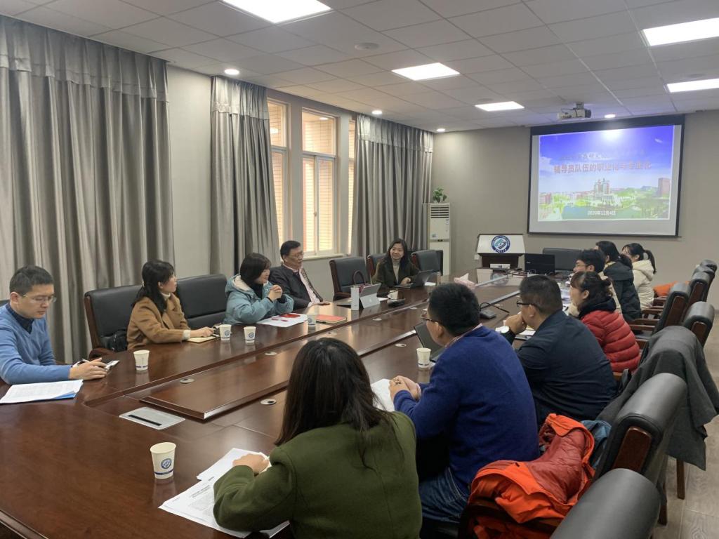 随后,团队成员开展讨论。胡景谱认为,我们首先应厘清辅导员队伍专业化职业化建设与高校高质量发展、“三全育人”工作之间的关系,明确定位,再制定相应评价标准。文丽丽以辅导员工作年限的转岗问题为切入口,指出辅导员因工作涉及面广、角色模糊和家庭压力等特殊性原由,使得辅导员队伍专业化、职业化的难度系数较高,并提出了解决路径:一方面,学校依据辅导员个体的性格、爱好和专业背景等要素进行工作性质分类,并制定相应的考核与培养机制;另一方面,辅导员在学生群体中的重要性角色与在高校整体环境下话语权不突出之间存在矛盾,学校对辅导员的重视度需提高。唐青通过分析辅导员身份的双重身份,对其优势进行了阐述,并指出现阶段该结构平衡的失调,辅导员更多侧重其管理身份。在辅导员的专业化、职业化培养的问题上,她认为需通过传输正确的政治导向,激活辅导员的内在需要,来加强辅导员队伍建设。团队其他成员也分别就辅导员队伍面临的职业发展路径不清晰、专业评价指标体系较缺乏、工作内容较为庞杂等问题开展了分析和讨论,并从学校顶层设计、辅导员自身认识等角度提出了建议和合理性路径选择。