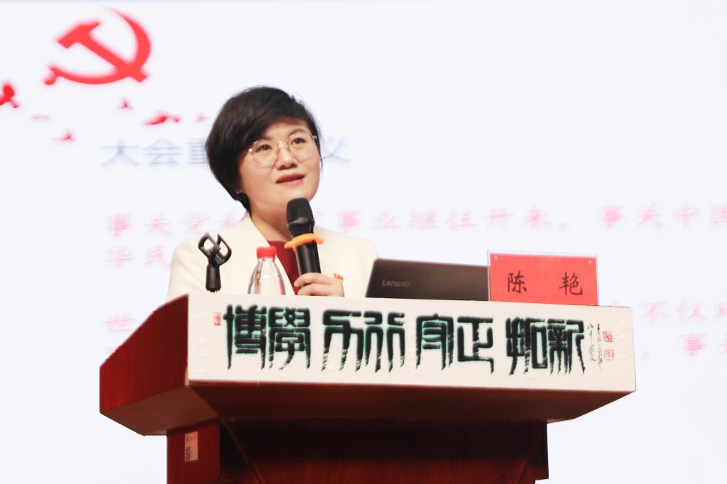 陈艳以“深入学习贯彻党的二十大精神,努力成为担当民族复兴重任的时代新人”为题,分享了自己参加党的二十大盛会的体会和感受。她结合党的二十大报告的框架结构,围绕“建党精神”“中国式现代化”“坚持人民至上”“把青年工作作为战略性工作来抓”等方面内容,通过一个个生动的故事,将党的二十大精神娓娓道来,讲到动情之处,许多同学热泪盈眶。