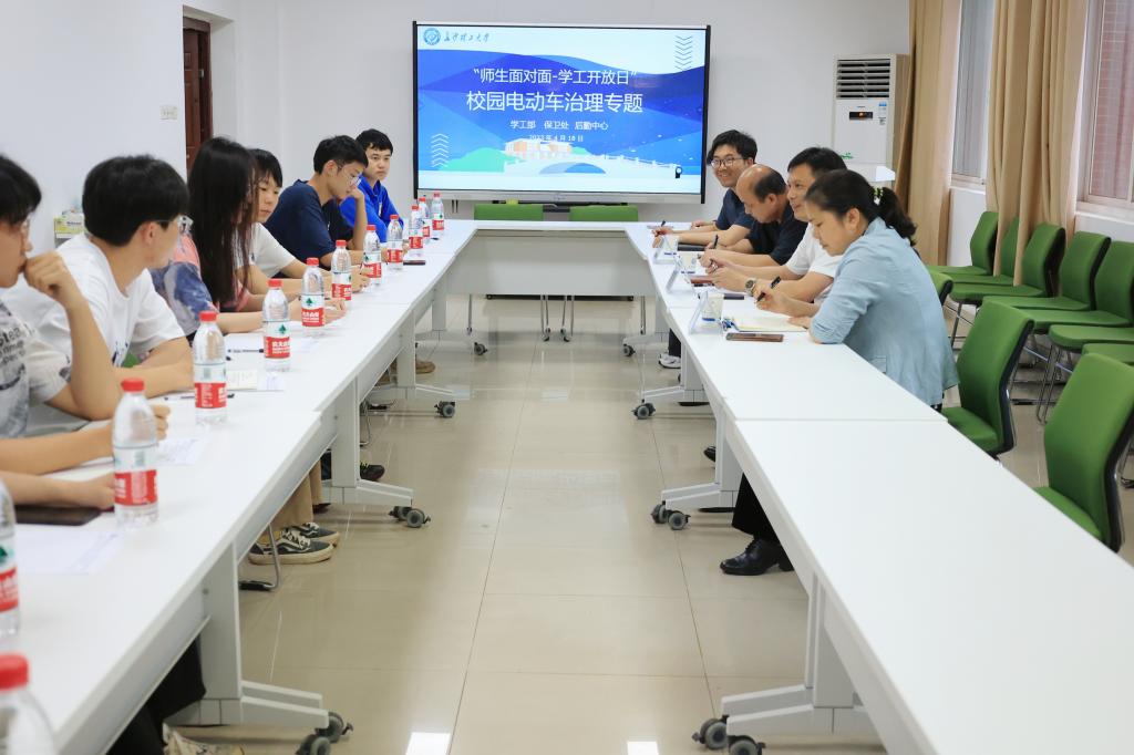 4月18日下午,第十四期“师生面对面·学工开放日”电动车安全治理专题座谈会在学生活动中心418举行。学工部(处)、保卫处、后勤中心负责人与来自各学院的十余名学生代表进行交流座谈。