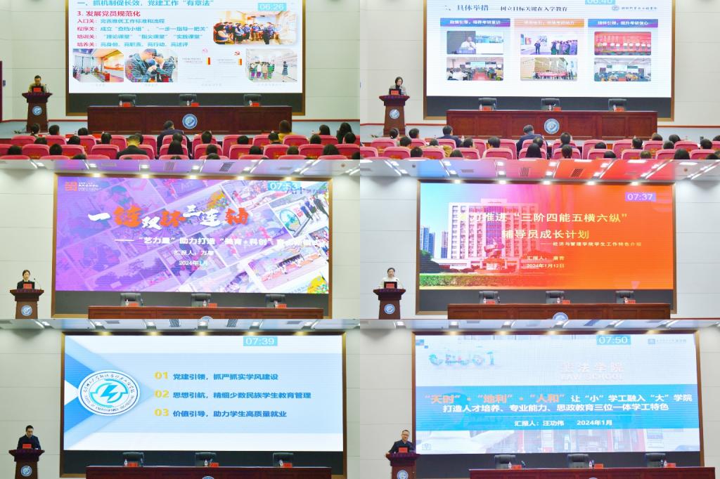 会上,交通学院、经管学院、能动学院、材料学院、法学院、艺术学院就学院学生工作特色进行了现场交流,其他学院以书面形式进行了交流。