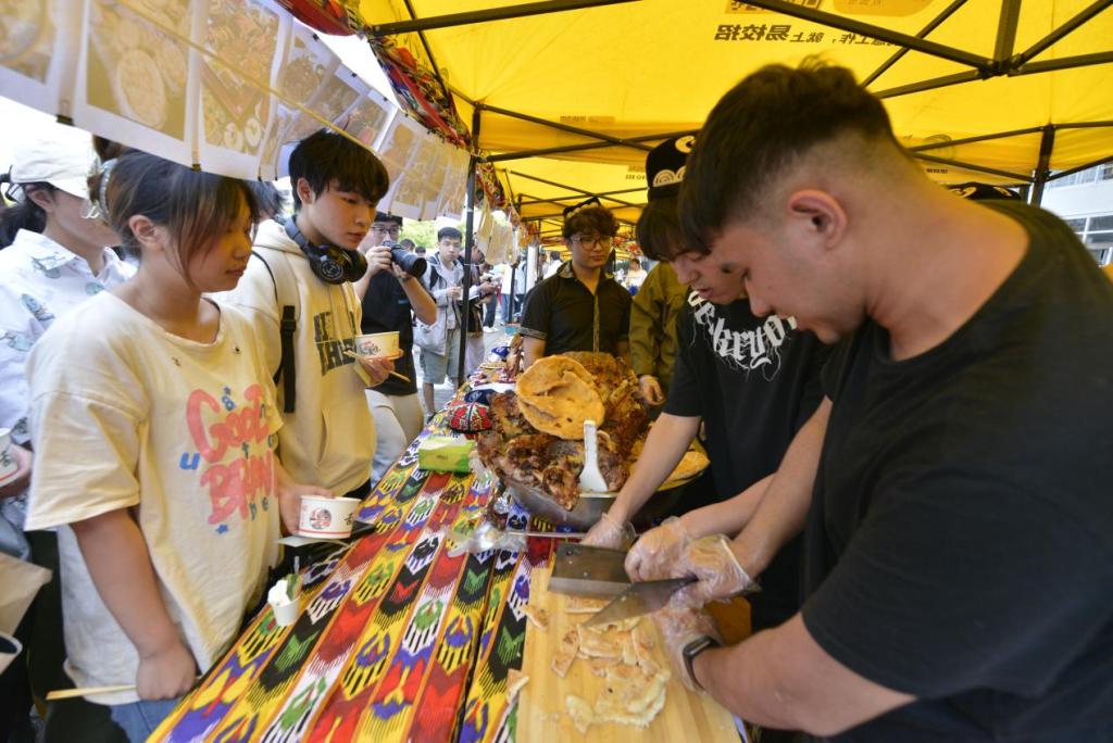 在互动活动区,师生参与制作手工艺品、趣味游戏,品尝由植物染色的七彩糯米饭、烤全羊等美食。其中来自食品学院的“长理情怀”学生创业团队带了来自内蒙古的奶酪、奶糖等奶制品,成员罕克表示,为响应“大众创业、万众创新”的号召,团队在学校的创业园注册了公司,未来也将结合所学专业继续传播民族文化。