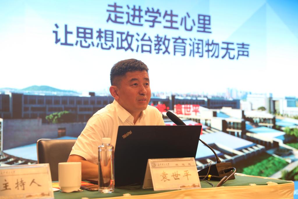 袁世平以《走进学生心里,让思想政治教育润物无声》为题进行报告。他详细阐述了自己在学校思想政治工作理论课教师座谈会上的感悟,指出习近平总书记强调“思政课既要有惊涛拍岸的气势,也要也润物无声的效果。” 认为学生工作要成为滴落在学生心里的一场场春雨,助力学生的成长。