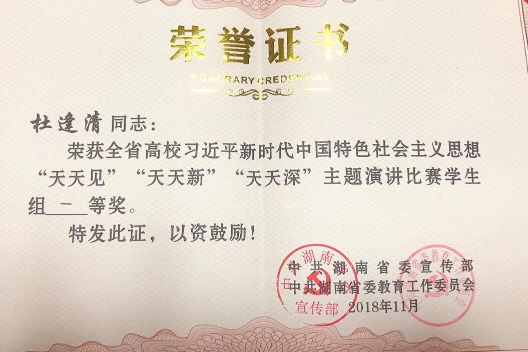 11月23日,由中共湖南省委宣传部、湖南省委教育工委、省教育厅主办的湖南省习近平新时代中国特色社会主义思想“天天见”“天天新”“天天深”演讲比赛(学生组)在湖南省教育电视台举行。来自全省各高校的选手参加本次比赛。经过复赛、决赛两轮激烈角逐,伟德经济与管理学院财务管理专业2016级学生杜逢青获得一等奖。省委宣传部副部长肖君华为其颁奖。