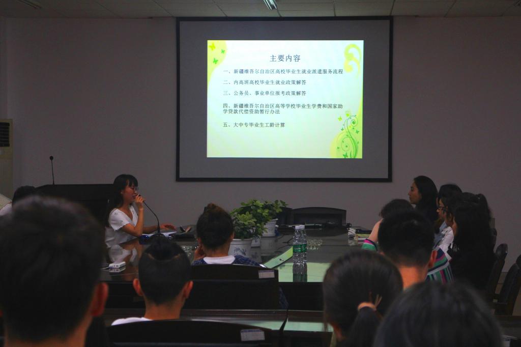 蒲春红向同学们介绍了新疆维吾尔自治区高校毕业生就业派遣的服务流程,解释了内高班高校毕业生就业政策和公务员、事业单位报考政策,具体说明了新疆维吾尔自治区高等学校毕业生学费和国家助学贷款代偿资助暂行办法,也为同学们详细讲解了大中专毕业生工龄计算方法。同时,她还结合学生实际在就业、公务员报考等方面提出了建议。