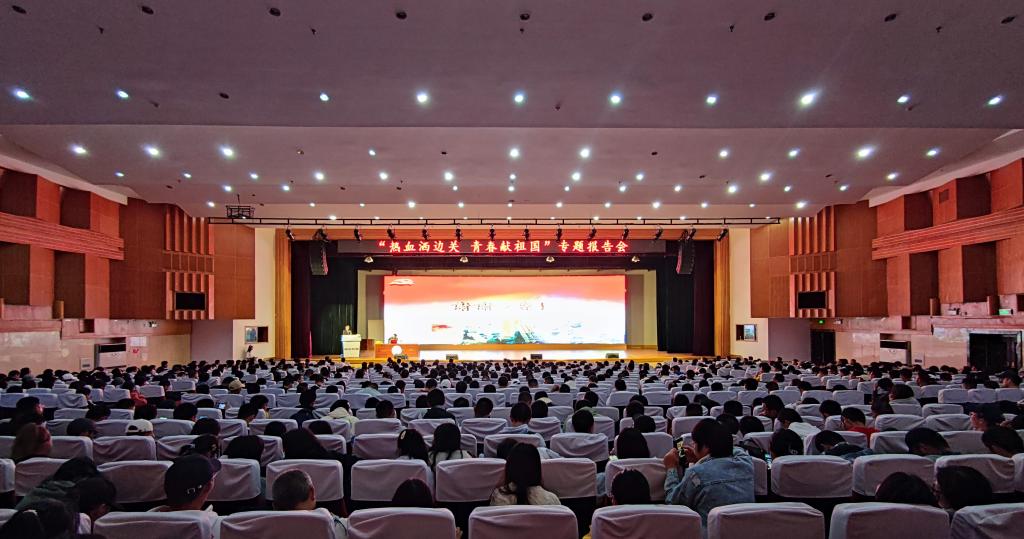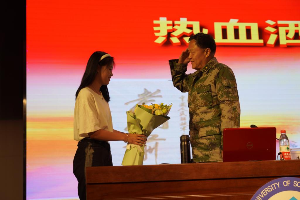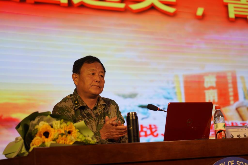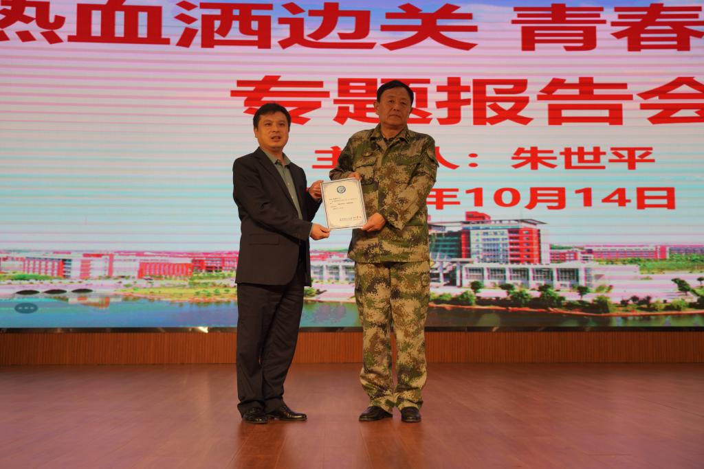 朱世平介绍了自己和战友两次参战的时间和环境,详细讲述了那段波澜壮阔、刻骨铭心的历史。“誓师、出征、牺牲……”一张张弥足珍贵的战地照片、一段段触目惊心的实况录像、一个个感人至深的英雄人物,生动再现了当年硝烟弥漫的战场和英雄们驻守老山的事迹。朱世平特别回忆了歌曲《生死兄弟》的创作背景:1988年1月10日在实施出击作战时,突击队员张鹏遭敌重机枪的射击,大腿根部被打穿,鲜血直往外喷,无法包扎止血,疼的大声喊“打死我吧!你们快撤!”不到40秒就牺牲在我的怀里,献出了他年仅22岁的宝贵生命……说到痛失战友,朱世平忍不住泪湿了双眼。现场师生被“热血洒边关,青春献祖国”的大无畏精神深深震撼。