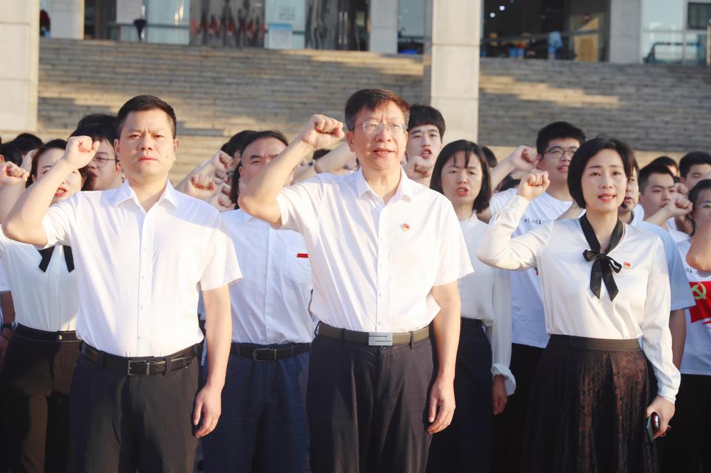 在学生代表的带领下,全体师生郑重的举起右手,面向国旗,共同发出“以青春奋斗助力中华民族伟大复兴”的铮铮誓言。