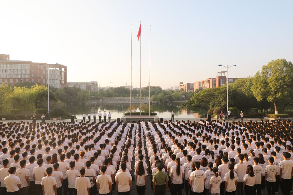 清晨7点,国旗班队员们迈着整齐而坚定的步伐护送五星红旗入场。伴随着庄严的国歌声,五星红旗在习习晨风中冉冉升起。在场师生高唱国歌,向国旗行注目礼。国歌唱毕,全体肃立,缅怀先烈,向人民英雄致敬。
