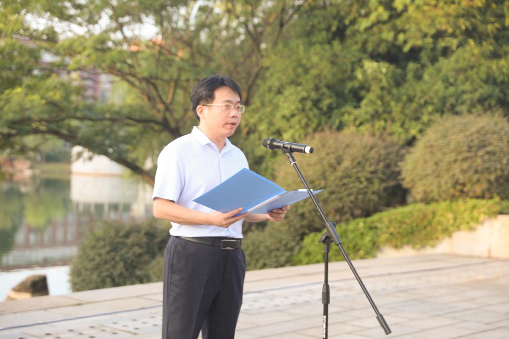 国旗下,学生代表敬读人民英雄纪念碑碑文,表达追思之情,感悟英烈初心,慷慨激昂的诵读声响彻云影湖畔。