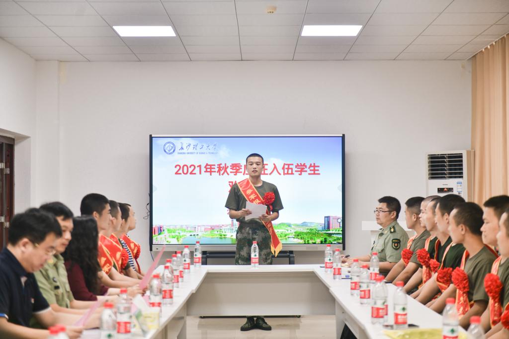 会上,入伍学生代表、设计艺术学院2020级韩龙亿豪讲述了入伍初心和对军旅生活的期待,并表示将秉承“博学、力行、守正、拓新”的八字校训,在参军路上不懈拼搏,为校争荣,为国争光。他代表全体入伍学生庄严承诺:请党放心,强国有我,到祖国需要的地方建功立业!