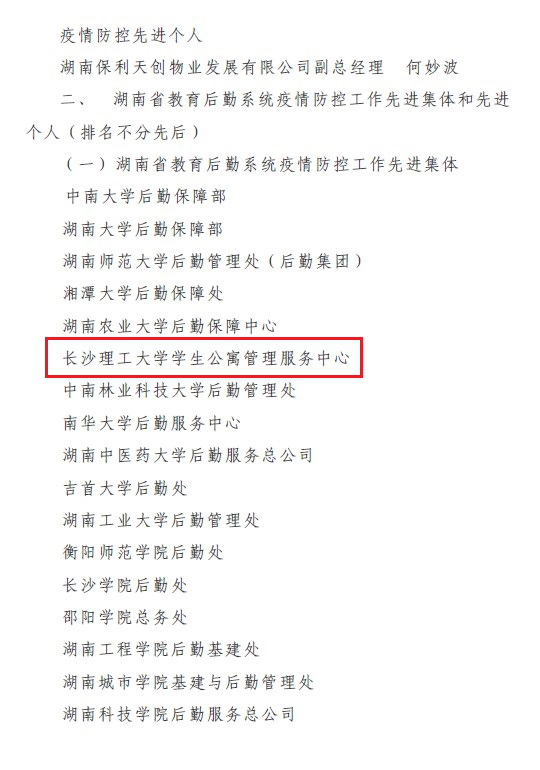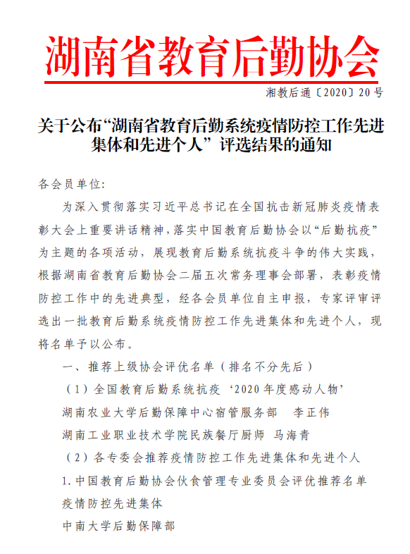 近日,在湖南省教育后勤协会组织开展的“湖南省教育后勤系统疫情防控工作先进集体和先进个人”评选中,伟德公寓中心荣获“湖南省教育后勤系统疫情防控工作先进集体”。
