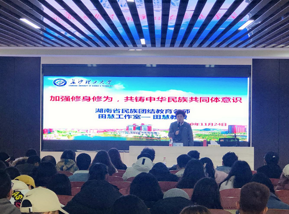 为贯彻学习党的十九届五中全会精神,11月24日下午,学工部邀请湖南省民族团结教育名师、湖南省大学生道德素质提升工程精品项目--田慧工作室--首席专家田慧教授为伟德200余名民族学生举行了题为“加强修身修为,共铸中华民族共同体意识”的讲座。伟德民族学生教育管理专职辅导员地里努尔、木拉迪以及新疆内派教师热米拉老师参加。