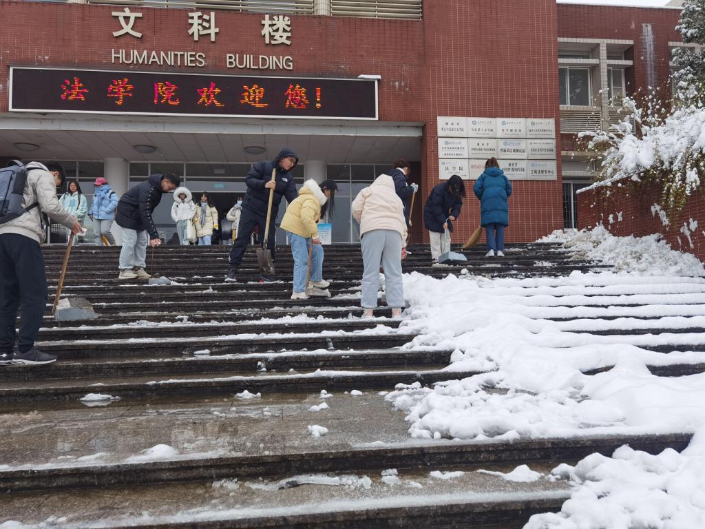 土木学院组织学生在云塘校区综合教学楼开展扫雪活动,确保了师生出行安全和研究生考试有序进行。交通学院、水利学院的师生在行健轩园区开展扫雪活动,他们挥动铁锹、舞动扫帚、布设麻袋,积极投身于扫雪这场“战斗”中。法学院组织学生在文科楼开展了清扫积雪活动。城南学院和继教学院组织学生干部在金盆岭校区教学楼和楼栋周边的主干道开展了扫雪活动。各学院还组织了学生在所负责的劳动教育实践基地责任区域中的道路进行了铲雪扫雪工作。