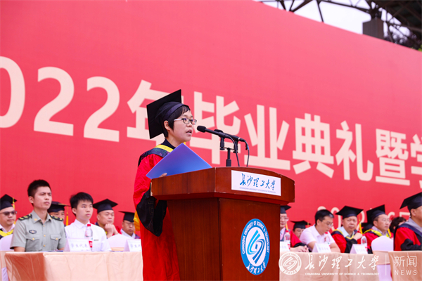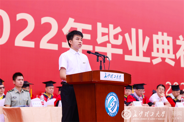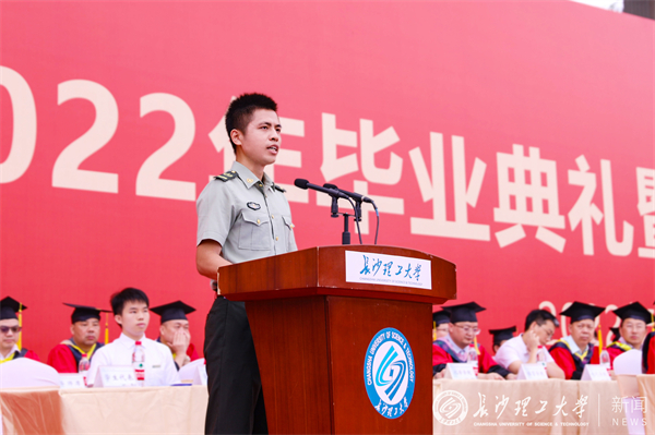 毕业生代表、计通学院蒋利杨饱含深情地回望了初识长理、参军入伍、退役复学的经历,并庄严承诺2022届毕业生将谨记长理之校训,带着长理的烙印继续“发光”,将小我融入大我,在实现中华民族伟大复兴的时代洪流中踔厉奋发、勇毅前进,用“长理蓝”描绘出最动人的“中国红”!