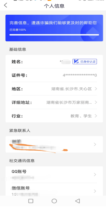 2.下载国家反诈中心APP后,完善个人信息进行实名认证(信息完善率要求100%,并截图保存),地区请选择“湖南省长沙市天心区”。如图2:
