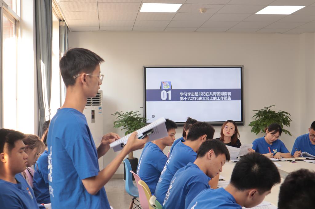 此后,陈璐莎带领全体成员共同学习共青团湖南省委书记李志超在共青团湖南省第十六次代表大会上的工作报告,各部门成员积极发言,热烈讨论。校团委基层团建部单基焕分享了与学长相处的故事,“我们学生干部应如志超书记所言,争做青年友,不做青年‘官’”。校学生会科技部陈嘉瑜受到报告启发后谈到,学生干部需要不断思考和探索提升科创竞赛项目质量的方法,营造“人人参与”的校园科创文化氛围。陈璐莎强调,伟德共青团工作应以人才培养为中心,服务全面建成百强大学大局,着力提升“硬指标”与“软实力”,促进科技创新能力提升,丰富校园文化内涵。