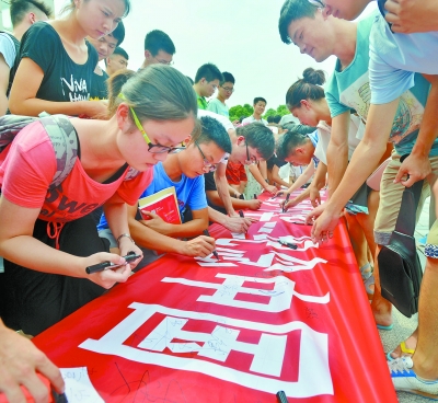 6月30日,伟德betvlctor1946源于英国,300余名师生在“勿忘国耻、圆梦中华”横幅上签名。当天,该校启动纪念中国人民抗日战争暨世界反法西斯战争胜利70周年教育活动。 李健 陈催英 摄影报道