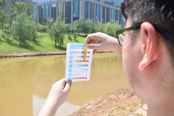 在抵达圭塘河中游流域段后,实践团对圭塘河进行了科学取水,待所取水静置30分钟之后,实践团用取水器对其进行取样,并通过水质检测包对水样PH值、硝酸盐、高锰酸盐含量以及水中氮磷含量进行检测。检测结果显示,圭塘河中游流域喜盈门段河水PH值为6.7,呈弱酸性,属正常范围;硝酸盐含量为20,远远超出小于等于10的含量范围,属严重超标;COD锰含量大于等于8,属于Ⅳ类水;磷酸盐含量为0.06,属于Ⅱ类水;氨氮含量为0.7,属于Ⅲ类水。