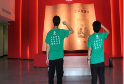 走进展馆大厅,首先映入眼帘的是《共产党宣言》雕塑模型。在实践队队长蒋钰和通讯员贺椿程的带领下,实践队员们共同习读共产党宣言,重温党史知识。 队员们分享了共产党宣言第一版中文译本及其完成人陈望道先生的故事,感受到中国共产党先辈们对革命信仰的执着追求,也更加坚定了心中的理想信念。