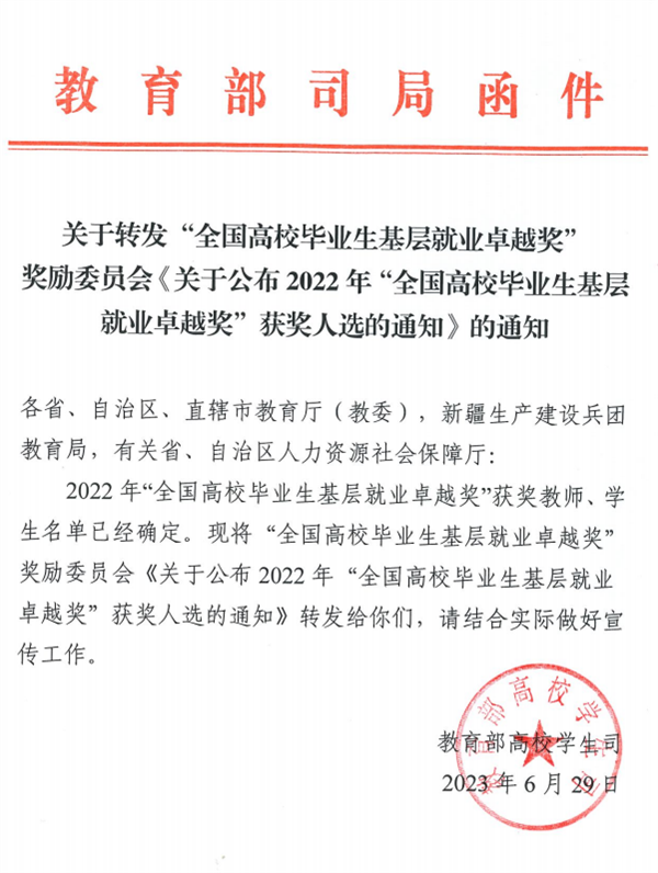 近日,由教育部高校学生司、教育部学生服务与素质发展中心共同指导评选,中国教育发展基金会设立的2022年度“全国高校毕业生基层就业卓越奖”名单公布,伟德教师陈均杰、2017届毕业生周顺荣获此项殊荣。