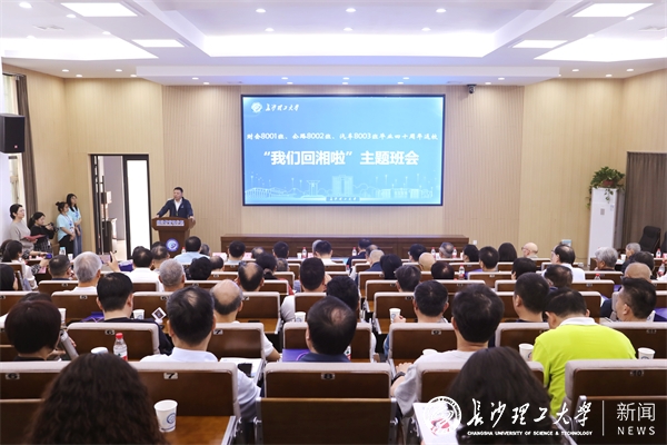 在金盆岭校区经管大楼报告厅,校友们举行了一场别开生面的“我们回湘啦”主题班会。校党委书记付宏渊、副校长谈传生出席班会。10名授课教师代表、校友中心和相关学院负责人参加。