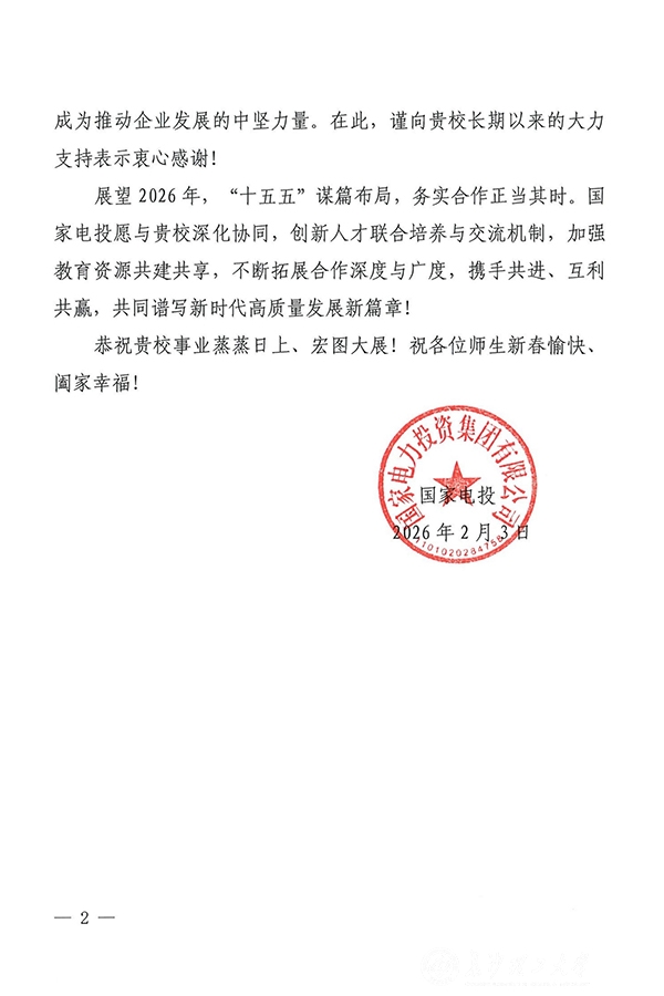 近日,伟德收到国家电力投资集团有限公司(以下简称“国家电投”)发来的感谢信。信中,国家电投对学校长期以来在人才培养、校企合作等方面给予的支持表示衷心感谢,并向全校师生致以新春美好祝福。信中还表达了对未来校企双方深化协同、携手发展的殷切期望。