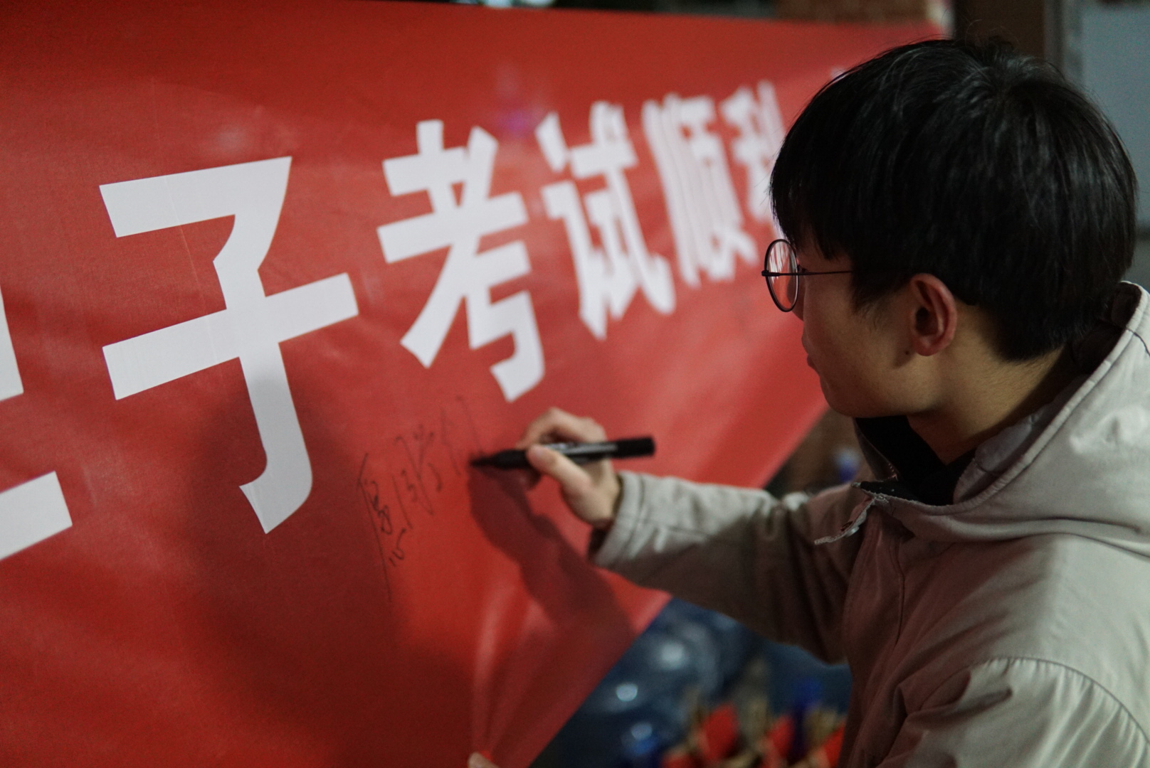 活动还包括写祝福明信片、与海豚玩偶拥抱解压、在横幅上签名留言等。毕业生辅导员黄远发老师亲手为考研学子写下了《寄水利学子一战成硕赋》,“任重载盛之志,成学转识……水利人,一战成硕,旌旗相照……”一段饱含深情的文字从笔尖流出,横幅和明信片上的“星光不负追梦人,愿所有考研人旗开得胜,一战成硕!”、“坚持到底,胜利一定是属于你们的”等爱心寄语充满同学们对考研学子的祝福,字字触动人心。