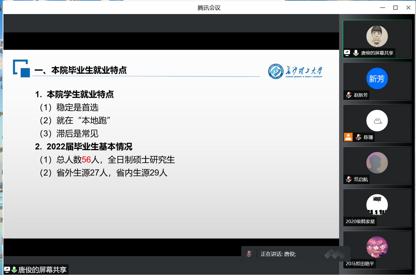 会上,副院长唐俊首先针对当前严峻的就业形势进行了简单介绍。他表示,2023届毕业生就业形势依然严峻,毕业生要有危机感和紧迫感,要将就业工作摆在重要位置。随后,他就本院毕业生就业特点、2022届毕业生基本情况、2023届学院毕业生求职注意事项、就业信息搜索与管理、简历制作等方面的内容进行了详细说明。针对这些问题,唐院长给出同学们几点建议:第一,确保心态良好,积极自信。第二,做好线上面试前的准备。第三,把握面试过程中需要注意的问题。第四,面试结束,应保持联系,尽早获悉结果。
