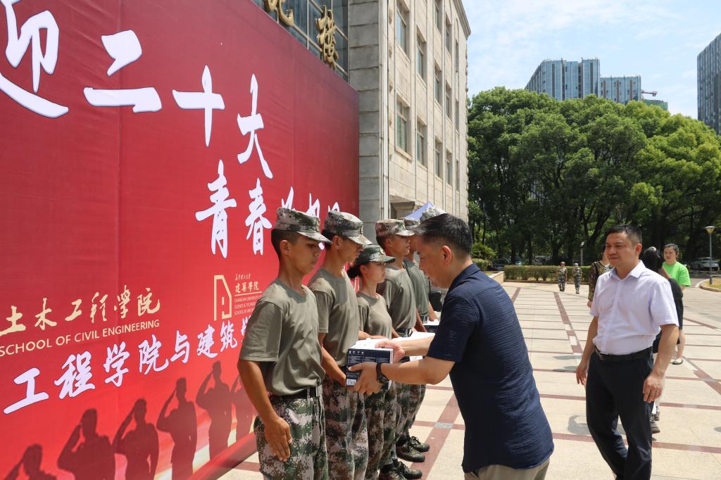 9月8日上午,建筑学院党委书记熊鹰、院长杨瑛、副书记李家春、副院长刘丹,到金盆岭校区电苑楼前坪看望慰问承训教官和2022级新生。建筑系主任吴荻子、党政办刘细玲、学工办周芳、王宇霖老师陪同。