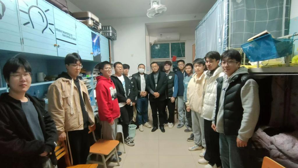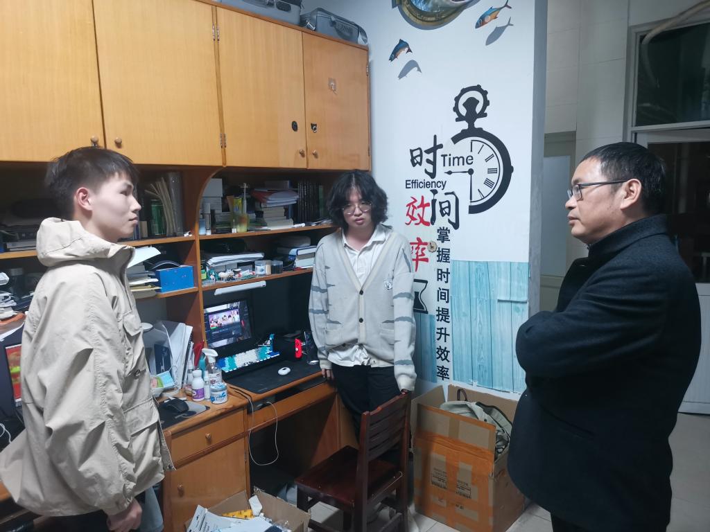 张国强来到20级人工智能专业的学生宿舍,他亲切的询问大家的生活情况、现在课程的学习情况以及今后的考研想法并给出相关建议和看法。同学们都积极说出自己的想法,大部分表示有考研的意愿,并且有的已经想好了目标学校和方向,他鼓励大家做好学业规划,并提醒同学们注意冬季寝室消防安全,做好个人疫情防控,非必要不外出。