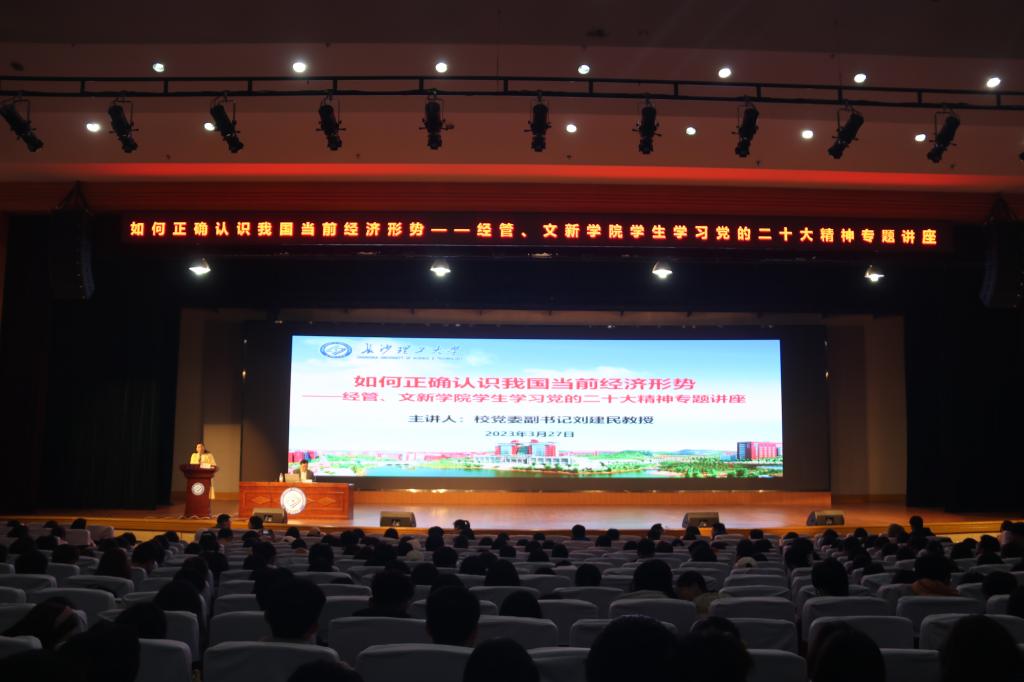 3月27日晚,经管、文新学院一千余名师生齐聚五教大礼堂,共同聆听校党委副书记刘建民教授以“如何正确认识我国当前经济形势”为主题的学习党的二十大精神专题讲座,讲座由经管学院党委书记丁丹主持,经管、文新学院相关党政领导、年级辅导员参与讲座。