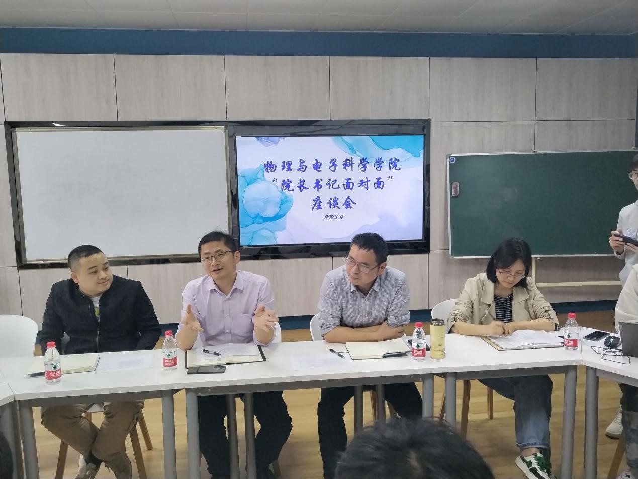 张卫兵向同学们介绍了物电学院人才培养体系和学院特色专业优势,鼓励同学们要有专业自信,要努力提升能力、传承知识、健全人格,并对2019年新设的人工智能专业的考研方向进行了详细的讲解。张国强肯定了同学们心系学院发展、积极建言献策的主人翁精神,指出学生代表要切实发挥好桥梁纽带作用,把同学们的日常需求用正当渠道反映给学院,也要将学院的相关政策、举措及时传达给同学们,学院将根据同学们提出的意见、建议,及时反馈落实,在不断改进中夯实学生的教育、管理和服务工作,切实提升同学的满意度和获得感。