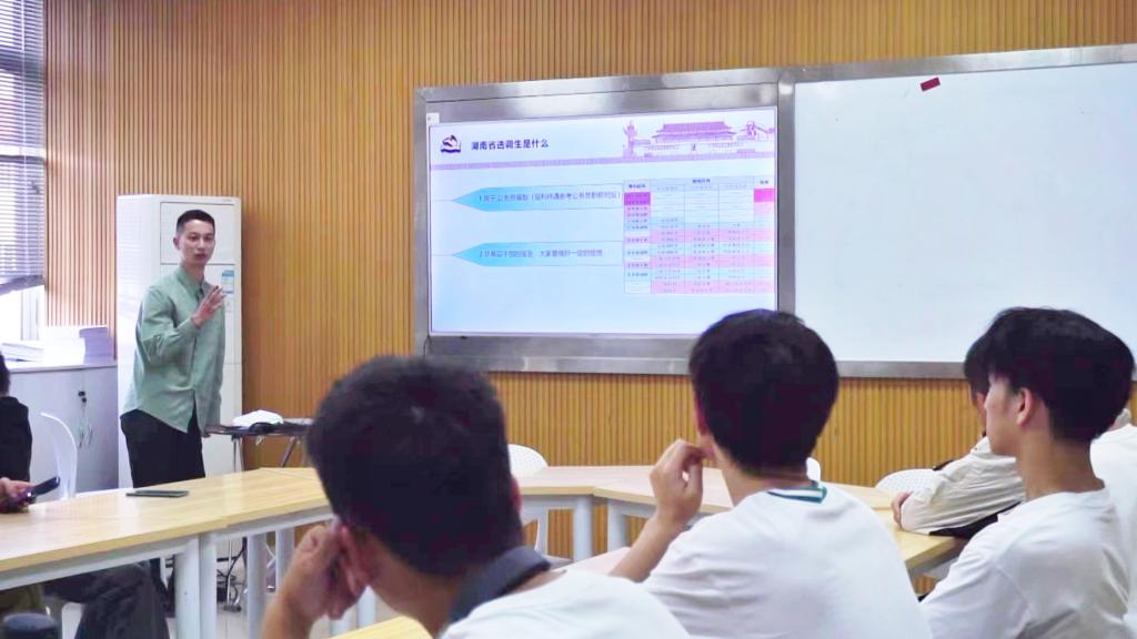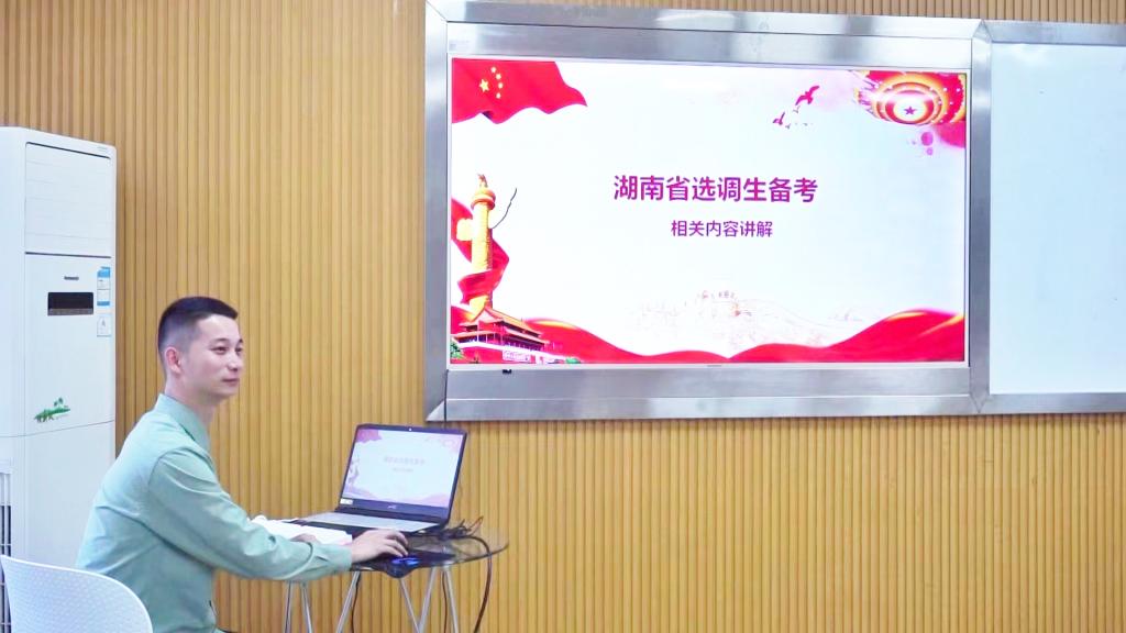 分享会上,孙泽文从湖南省选调生是什么、湖南省选调生的招录条件、湖南省选调生招录流程介绍、湖南省选调生的备考tips等几个方面向同学们全方位的介绍了选调生,并且向同学们具体地给出了选调生考试中笔试、面试的准备建议。他从工作性质、工作内容、交通、住宿等方面,图文并茂地向同学们展示了选调生的基层服务工作与生活,让同学们更深刻地理解和感受到选调生艰苦但充实快乐的工作生活风貌。