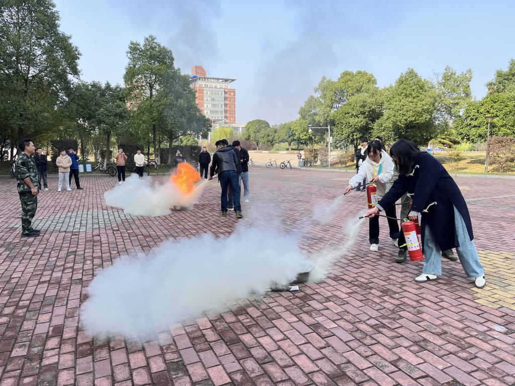 “消防防毒面具在使用前,请大家确保密封未破坏再进行使用……”在工一东侧前坪,易国安、梁继超对同学们的逃生演练情况进行了点评,并对火灾逃生要点进行了讲解,随后对消防防毒面具、干粉灭火器的使用方法进行了说明,同学们积极学习和尝试佩戴消防防毒面具。随着火堆被点燃,同学们开始灭火实践演练,在实践中巩固技能,熟练掌握了灭火器具使用方法。