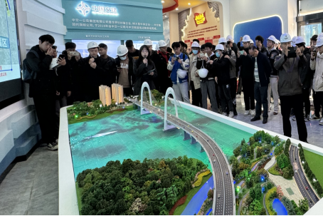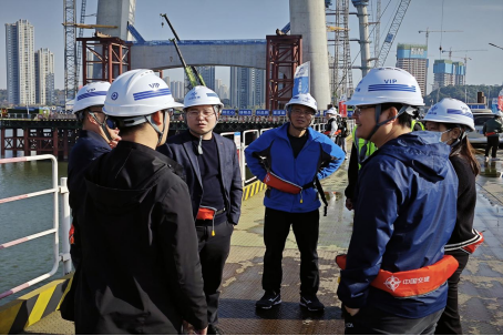 本次观摩见习活动分为两个参观区域,首先,大家在项目负责人的陪同下前往项目智慧工地党建管理中心参观学习,了解了项目各参建单位及项目工程概况,并学习了项目关键施工工艺流程、工程模型、企业发展史及党史等知识。随后,桥梁工程系师生前往该项目水中施工区域的主塔参观,水中主塔采用“湘江绣月”设计方案,意为“在湘江上绣一轮圆月”,抬头便能看见明月当空,低头则是星河倒影。在主塔下钢栈桥上远眺,南边是三汊矶大桥,北边是月亮岛湘江大桥,本桥与邻近两座桥梁相互映衬。